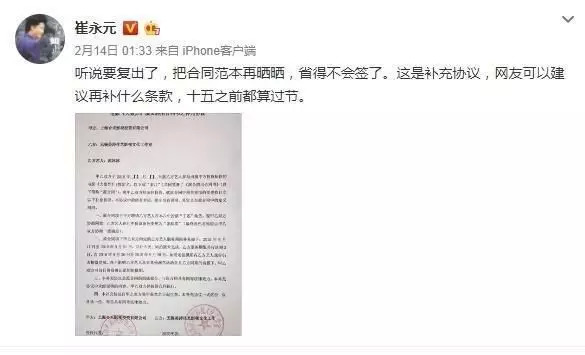 在《她杀》抛出最新剧照之前,有媒体爆料范冰冰的演艺工作正在逐步恢复正常。农历新年过后,某墨镜品牌官网和电商渠道更新范冰冰代言拍摄的广告图片。崔永元不久后开始在微博再次晒出“合同照”,没有点名的提到“听说要复出了”,说的显然是范冰冰。