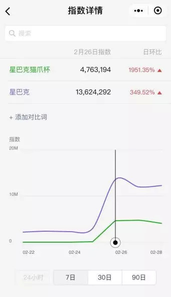 这样一款网红杯给星巴克带来的好处是显而易见的,尽管面临“饥饿营销”“过渡炒作”等质疑。但星巴克的关注度有了明显上升,“星巴克”一词的百度指数从2月25日的91105迅速上升到2月27日的1570123。“星巴克猫爪杯”的微信指数更是日环比上升了1951.35%。