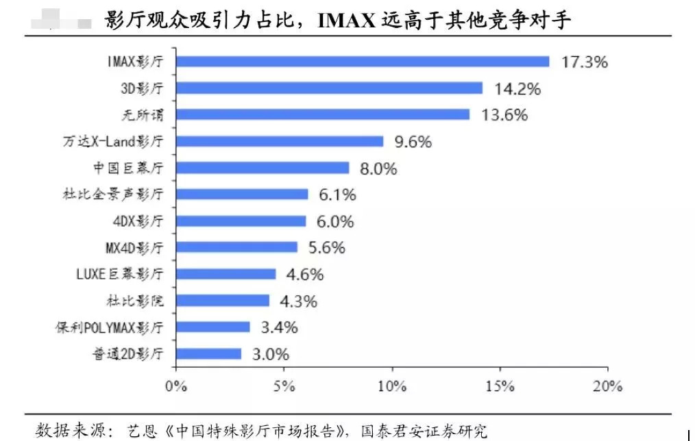 根据艺恩的调查数据,IMAX影厅对观众的吸引力占比为17.3%,杜比影院仅为4.3%,相差4倍多。