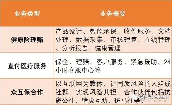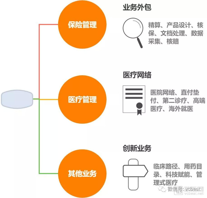 这就为第三方服务公司的出现和发展提供了土壤,第三方服务公司对于健康险公司的意义就是业务分拆和外包,比如最基础部分的IT系统规划与实施,保险产品设计阶段的市场调研、数据支持,产品和渠道管理,客户关系维护;核保、核赔两核业务,医疗服务网络的搭建,快赔直赔体系建立;以及日常健康咨询需求应答、健康管理等。
