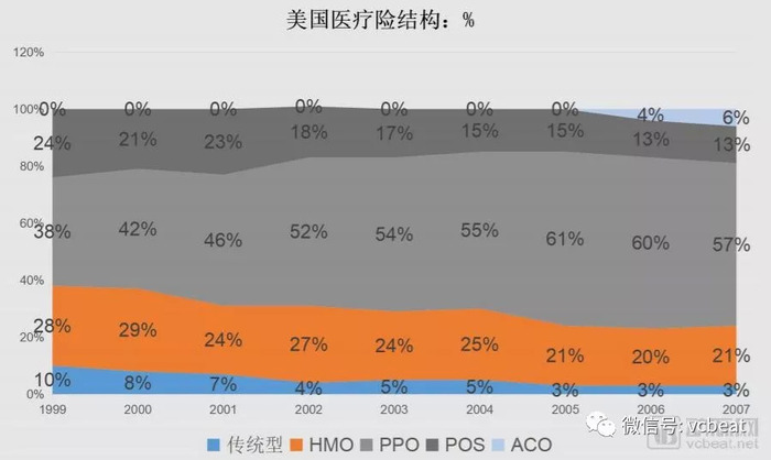 从费用报销型医疗保险向管理式医疗保险迈进,是健康险行业最重要的趋势之一。以美国为例,其商业健康险中HMO(健康管理组织)、PPO(优选医疗组织)规模迅速扩大,已经占到医疗险80%左右的份额。