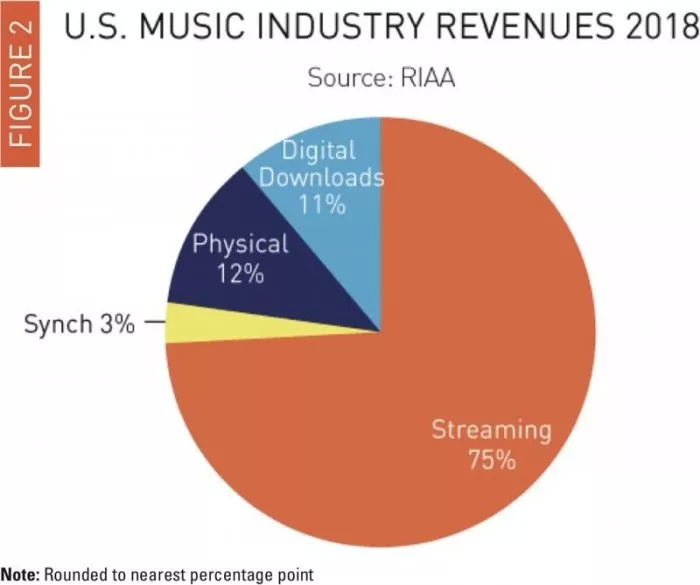 根据RIAA 发布的全新音乐产业年度报告可知,像 Apple Music、Spotify、Google Play Music、Pandora 等的串流音乐服务在 2018 年里不断发展壮大,已经可以贡献全美音乐营收的四分之三。串流平台的营收以每年 30% 的幅度增长,已经突破 74 亿美元。2018 年全美音乐产业营收为 98 亿美元,2017 年为 88 亿美元,2016 年则为 76 亿美元。