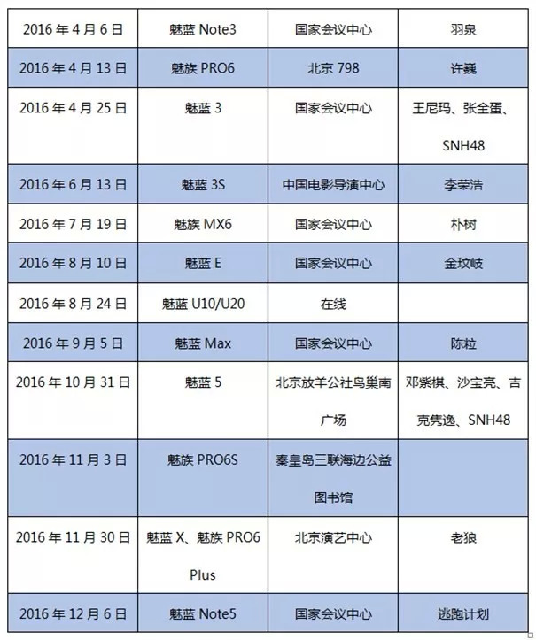 最夸张的当属2016年,魅族邀请十多位歌手,举行了12场发布会,发布了14款新品。