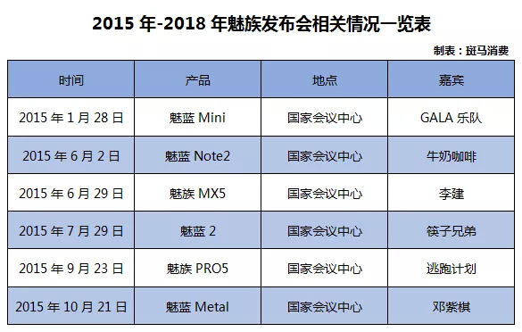 2015年,魅族开始其发(演)布(唱)会造势之路。当年,魅族在国家会议中心开了6场发布会,演唱嘉宾包括汪峰、邓紫棋、李建、筷子兄弟等。