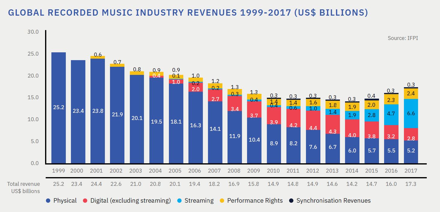据国际唱片业协会(International Federation of the Phonographic Industry, IFPI)发布的《全球音乐报告2018》显示,2017年全球唱片市场总营收达到173亿美元,同比增长8.1%,其中,音乐流媒体收入66亿美元,占全球音乐唱片产业总收入的38%,并同比增长41.1%。自2012年以来,音乐流媒体市场收入已增长超过5倍。