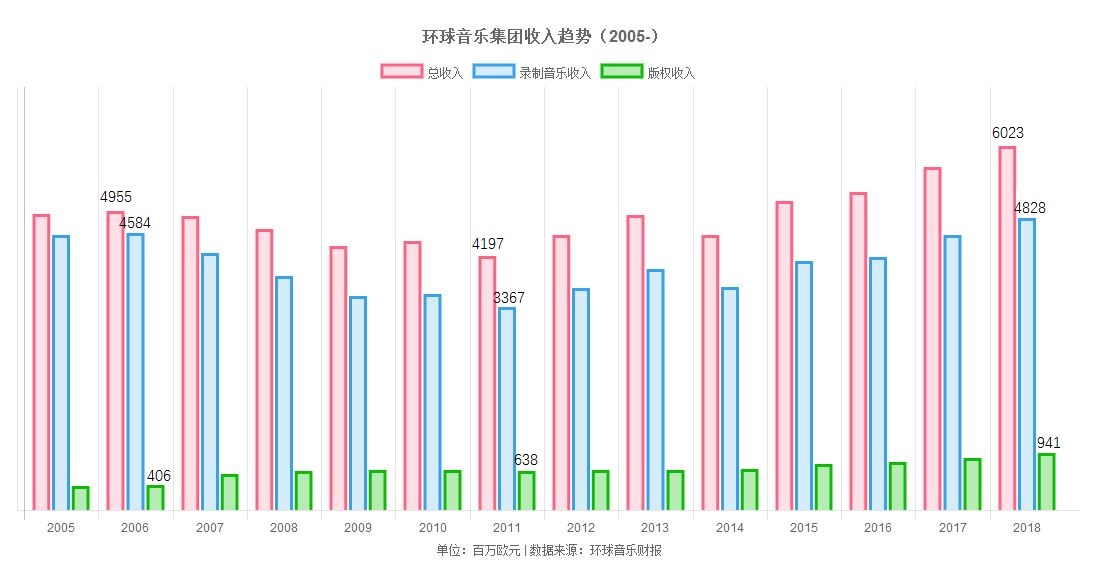 买归买,自投入维旺迪门下后,环球音乐曾经历过一段营收下降的时期,最终在2015年开始重新恢复增长。据2月14日发布的2018年财报,环球音乐2018年营收达到60.23亿欧元,同比增长10%,创历史新高。
