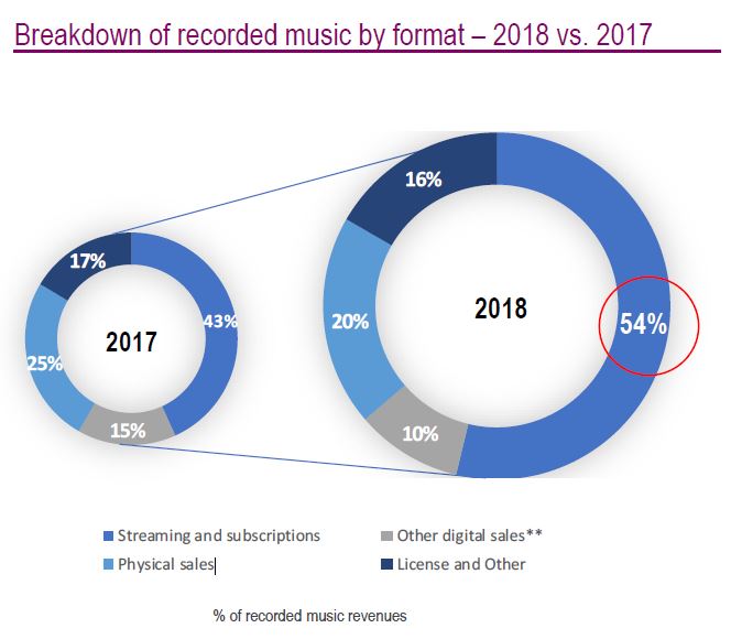 环球音乐录制音乐业务细分为流媒体收入(Streaming and subscriptions)、录制音乐授权(License and Other)、付费下载等收入(Other digital sales,Mainly downloads)、实体收入(Physical sales)。2018年流媒体收入首次实现对整个录制音乐业务收入占比过半,达54%,25.96亿欧元。同时,在付费下载收入和实体收入均呈现大幅下滑的形势下(分别为-26.6%、-16.1%),流媒体业务的增长带动整个录制音乐业务增长9.8%,并在整个环球音乐集团总收入占比43.1%。