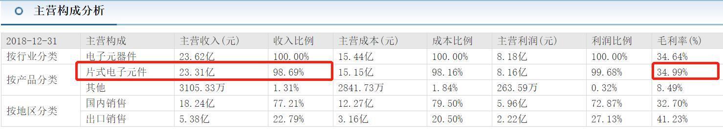 公司主要从事研发、设计、生产、销售新型电子元器件。电子元器件就是电阻、电感之类的元器件。片式电子元件占比98.60%,毛利率35%。