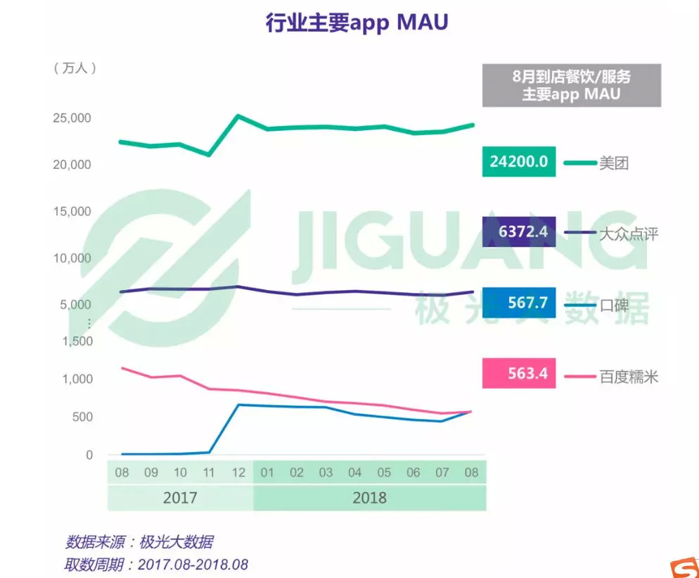 但从2017年开始,大众点评的月活开始陷入停滞甚至下滑。根据极光大数据的统计,从2017年12月开始,大众点评的月活出现了连续三个月的下滑。