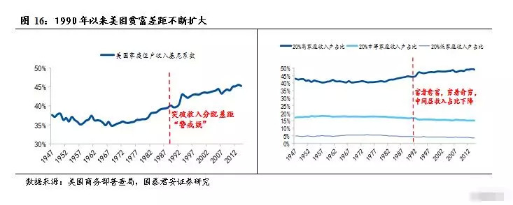 自1990年以来,美国国民收入差距不断加大,美国家庭住户的收入基尼系数在1988年突破了0.4的警戒线,并且随后不断上升