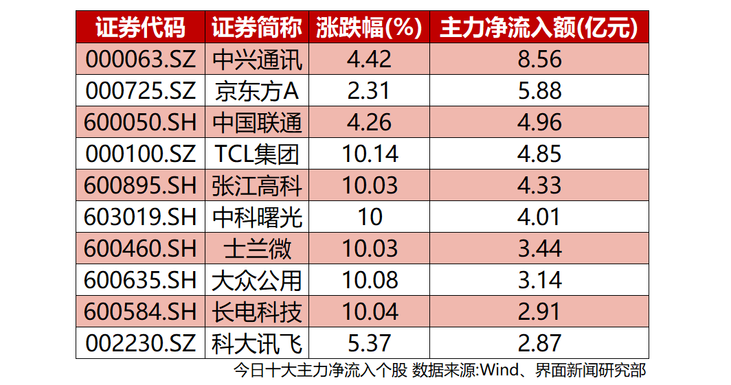 剔除尚未开板的新股,全天沪深两市主力净流入额超过1亿元的个股数量为53只。中兴通讯(000063.SZ)、京东方A(601099.SH)、中国联通(600050.SH)主力净流入额位居前三,分别为8.56亿元、5.88亿元、4.96亿元。
