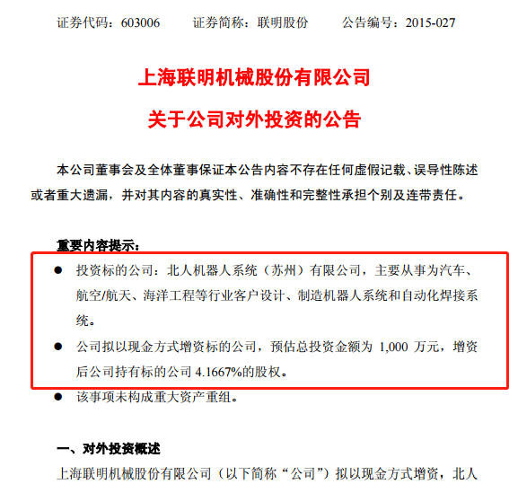 2015年7月,联明股份公告称,拟以现金方式增资北人机器人系统(苏州)有限公司,预估总投资金额为 1000 万元,增资后公司持有标的公司 4.1667%的股权。公司表示,当前其主营业务所需的焊接工艺均由自动化焊接系统实现,投资标的与公司主营业务存在协同效应。