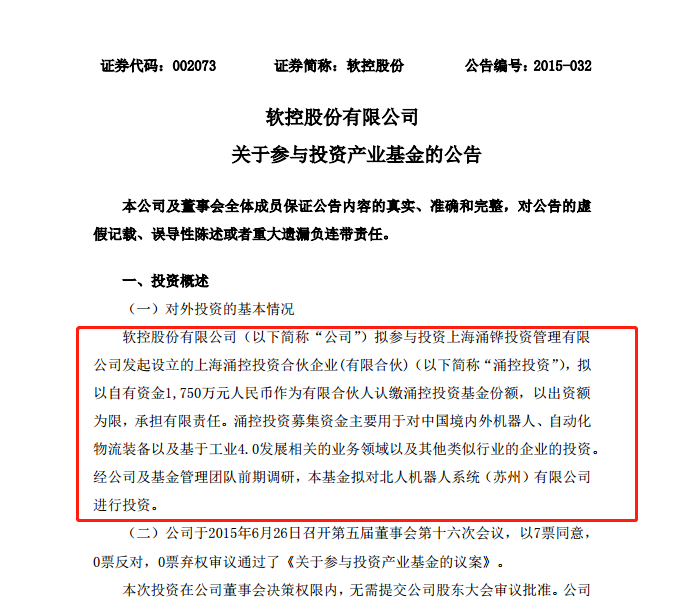 2015年6月26日软控股份公告称,其作为有限合伙人(LP)出资1750万元人民币,占出资额35%,该基金拟对北人机器系统(苏州)有限公司进行投资。