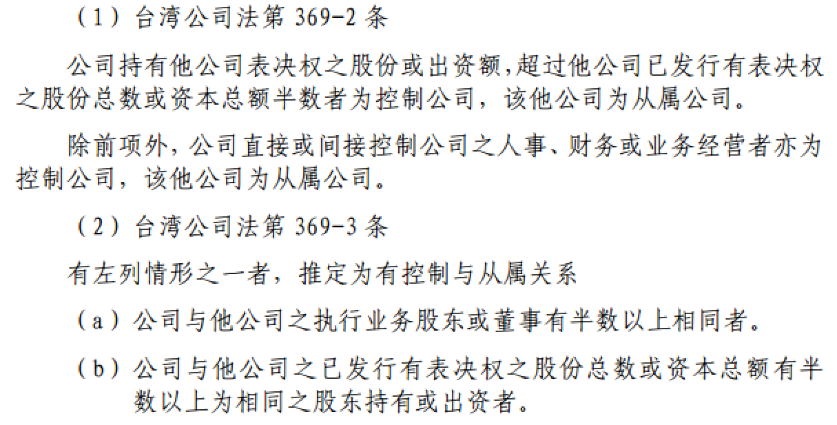 其次,中华映管还搬出了中国台湾公司法第369-2条及第369-3条,认为其与华映科技并不存在控制与从属关系。