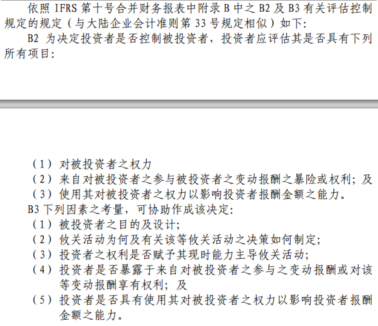 针对质问,中华映管首先搬出国际财务报告准则(IFRS)第十号公报。据中华映管描述,其虽然对上市公司的持股比例为26.37%,但中华映管总经理在2018年12月17日就辞任了华映科技董事长、董事的职务,这一操作令中华映管与华映科技间产生了微妙的变化。而根据IFRS第十号合并财务报表中附录B中之B2及B3有关评估控制规定的规定(与大陆企业会计准则第33号规定相似),中华映管有依据认定对华映科技丧失控制权。