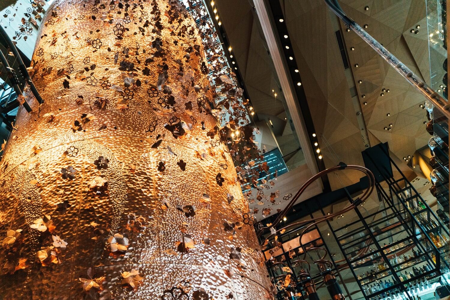 从店铺设计和整体菜单等元素,可以看出星巴克在烘焙工坊与东京本身城市的融合上设计了不少细节。店面由隈研吾操刀设计,最引人注目的是横贯四层垂坠而下的17米高的黄铜制樱花装饰,围绕着咖啡豆烘烤桶。店内还引进了不少日本本土产品,诸如隈研吾自己设计的餐具、印着星巴克logo的达摩玩偶和剑玉(一种日本传统玩具)。