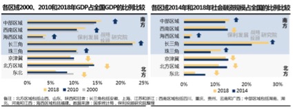 全国资金流向趋势亦印证了“南强北弱”的发展态势,从社会融资规模看,长三角及珠三角的资金汇集能力仍在提升,而除京津冀以外的广大北方区域,资金吸引力下降较为显著。