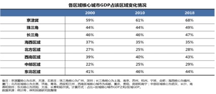 选取2000、2010和2018年三个时点,追踪各区域GDP占全国比重,可以看出:北方区域GDP贡献度普遍下滑,其中东北下滑最为明显;而以武汉为首的中部和以成渝为首的西南区域贡献度显著提升。