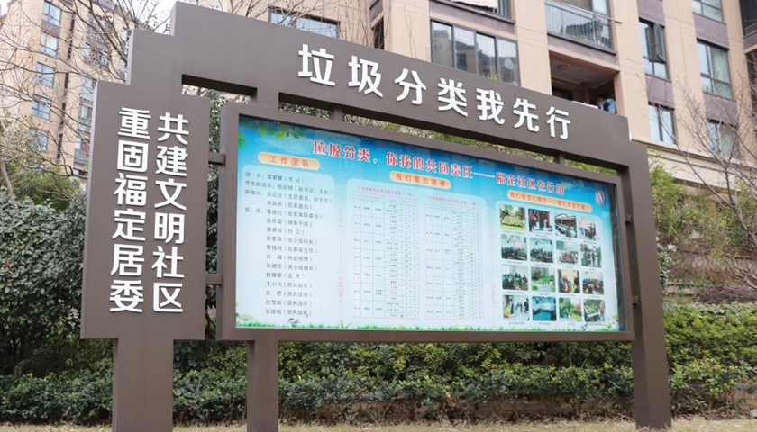 青浦区重固镇福定居委会党支部书记雷爱慧、主任徐正建设介绍,目前已撤销小区楼道的干湿两分类垃圾桶,合理设置四分类定时定点投放点位,增设“绿色账户”积分兑换机。在投放点位上,设立公示牌、管理责任告知书、当值人员信息、开放时间和分类收运信息等,同时配设了扫描员和破袋员,现场对居民进行分类投放指导。并且招募了120名志愿者,每人负责20户居民,面对面做分类指导。