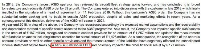 2018年四季度财报中关于终止A380生产的段落 来源:空客