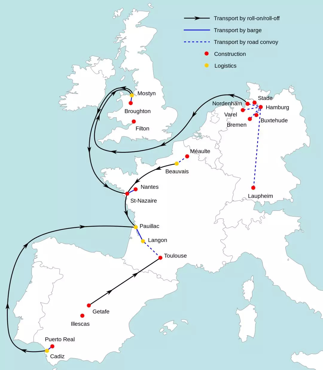 在圣纳泽尔,滚装船卸下从汉堡运来的机身组件,再装上在当地组装完成的更大型舱段,包括完整的机鼻,前往波尔多 (Bordeaux) 卸货。之后该船还要向南航行,到西班牙南部的加的斯 (Cádiz) 接收CASA制造的机腹和机尾,再将其送到波尔多。所有的A380舱段从波尔多通过驳船运到朗贡 (Langon),再通过超大型运输车队转运到图卢兹的总装车间。为了避免直接操作造成的损坏,车辆运输过程中各舱段均固定在特别定制的夹具中。