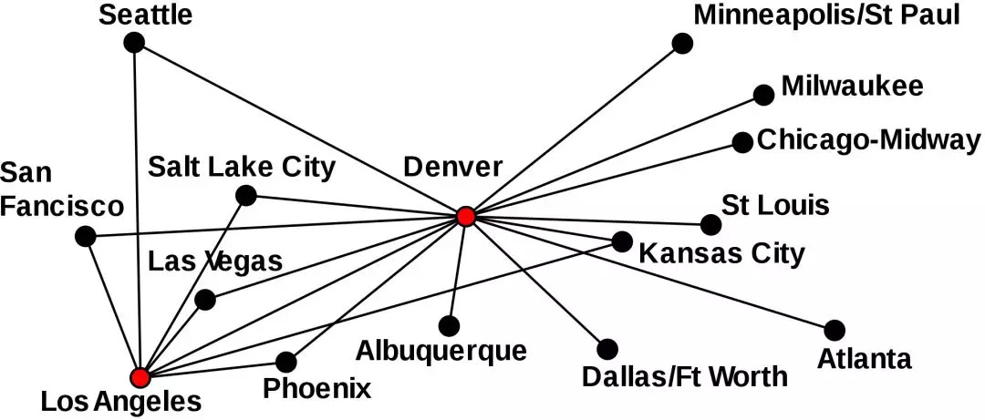 以美国中西部为例的辐条-枢纽分布范式;洛杉矶与丹佛在理论上是客流集散的枢纽 来源:网络