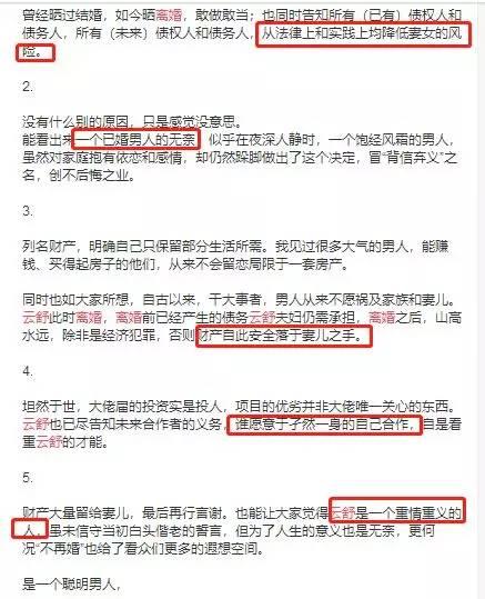 有称赞他敢做敢当,真爷们!也有对他的决定感到不解。有网友表示,这是“创业前的财产分割”,也有网友调侃,“并不是所有人都适合婚姻”,“简称云离婚?”。