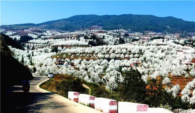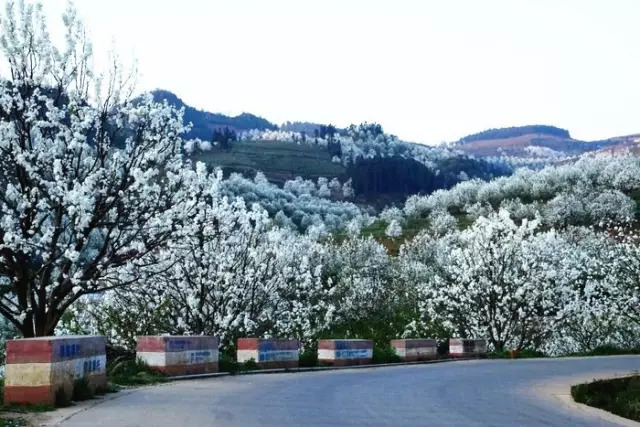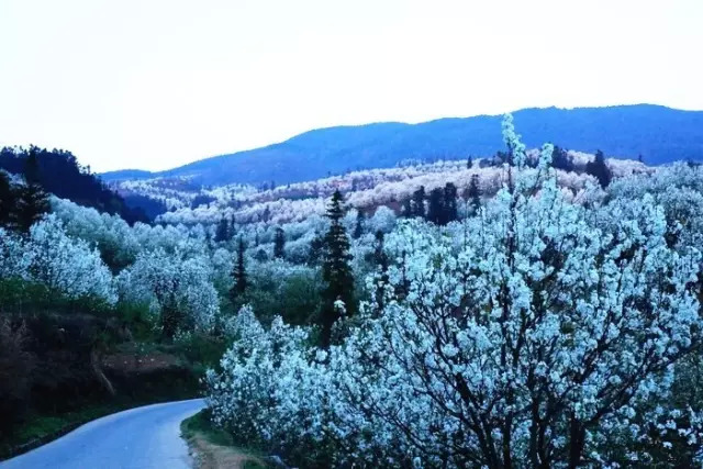 绕过几道弯弯曲曲的山路,眼前豁然开朗。起伏的山峦间,开始出现一簇一簇的梨花,随着山路的蜿蜒,那一树树梨花,和着一脉脉馨香,流动在春的明媚里。
