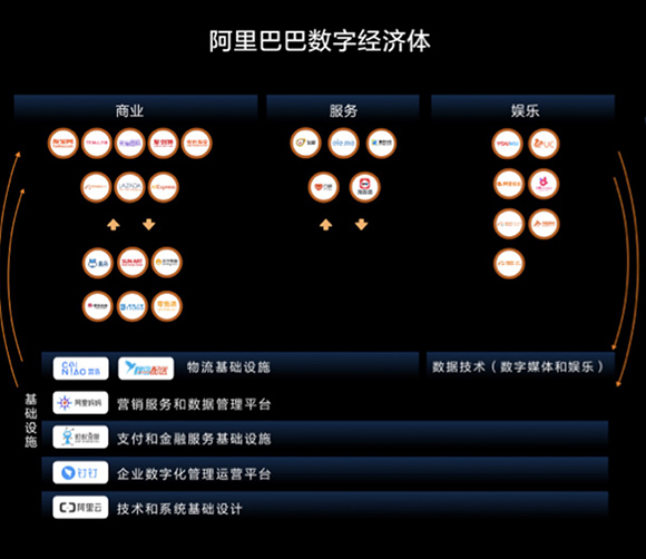 阿里巴巴现在业务范围已经涵盖传统的实物电商、本地生活到文化娱乐,覆盖了消费者主要的生活和商业场景,而经济体内的金融服务、物流和云计算等则提供了数字化转型的一系列基础设施。