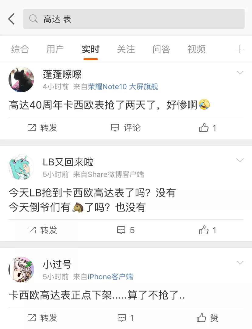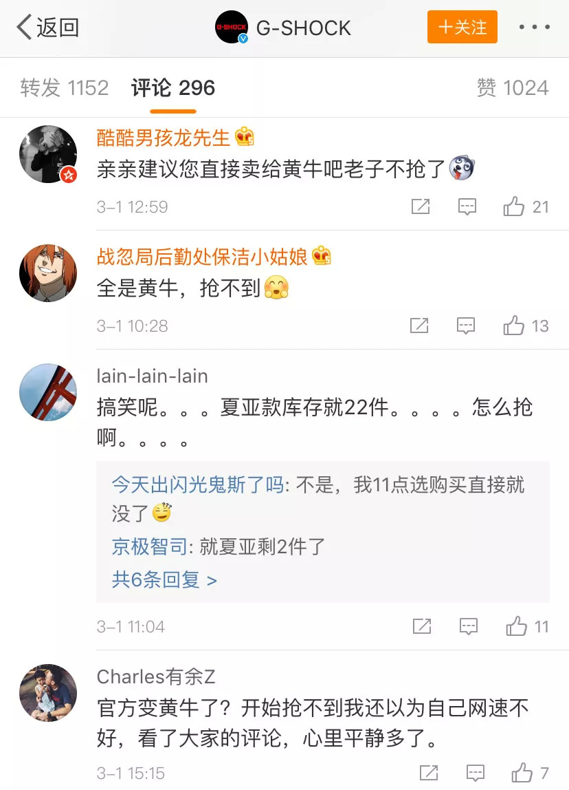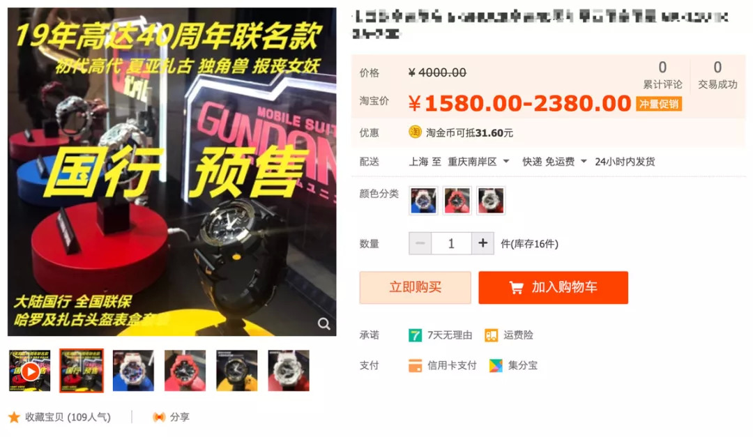 所以当许多国内的高达迷欢天喜地踩着时间点去购买手表时,却都遭遇到了“一秒没”或者“到点准时下架”的窘境,在@G-SHOCK 官微发布的相关宣传微博里,粉丝们的留言也都从最初的“买买买”,逐渐变成了一片骂声。而此时在淘宝、闲鱼等其他非官方渠道的购买链接里,这几款联名手表的价格已经上涨了数百元人民币,面对这样的不合理溢价,像老王这样最终放弃购入计划的粉丝,其实并不在少数。