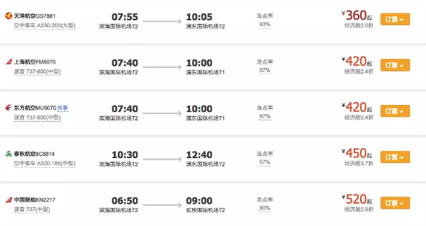 我们搜索了一下天津-上海的机票,在票价上是有一定优势的,不过下图中的票价是没有免费托运行李额的,加上行李额度的票价也是¥420。