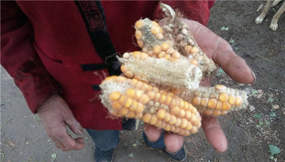 去年,于秀兰从这块田地里收获的玉米棒,个头只有正常玉米棒的一半大小,颗粒也长得参差不齐,表面白一块黄一块。如果这些也算收获的话,加起来每亩地的产量是100斤左右。