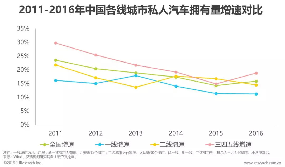 2018年我国车市遭遇了20多年以来的首次年销量负增长,在我国汽车行业传统增长动能日益萎缩的情况下,市场需要新的增长引擎。从我国千人私人汽车拥有量来看,一线、新一线和二线城市是过去拉动我国汽车销量增长的主要动力,然而在环境污染、交通拥堵的情况下,许多一二线城市的限牌限购政策阻碍了新车销量的增长。而在我国广阔的三四五线城市中,人们对车辆的消费能力和消费欲望与日俱增,未来有望成为我国汽车市场新的增长点。