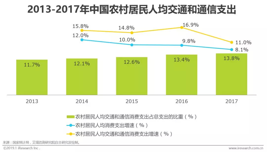 从消费结构看,2013-2017年,我国农村居民用于交通和通信支出的增长速度大于总支出的增长速度,用于交通和通信方面的支出占总支出的比重逐年增加,说明农村居民在交通和通信方面的消费意愿正在提升。从家用汽车数量看,2015-2017年农村每百户家用汽车数量增速超过城镇,农村汽车市场进入相对较快的增长时期。