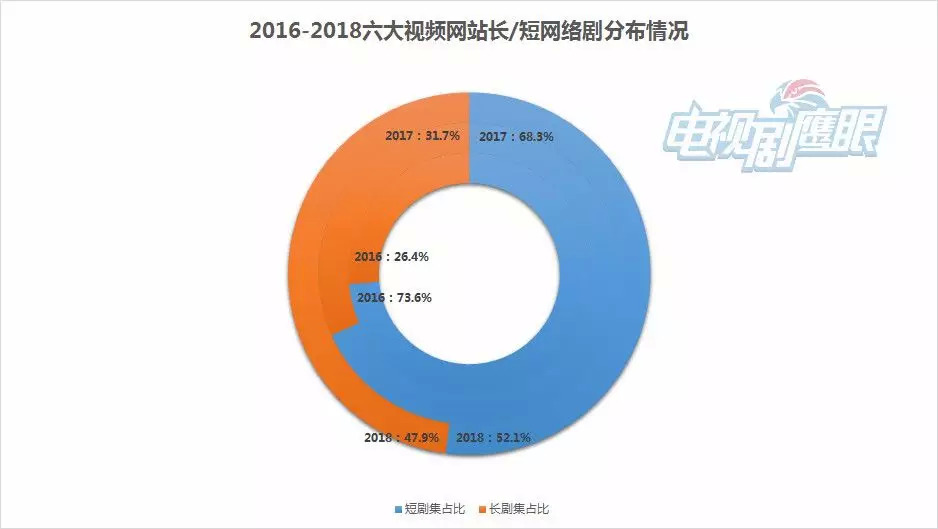 电视剧鹰眼(ID:TV-insight)对2016—2018年六家视频网站上线的网络剧做了数据整理,从中发现,2016年网剧进入高速发展阶段,受到网络端传播媒介的影响,展开了与传统电视剧差异化打法,大批短剧集网剧应运而生,全年数量占比高达73.6%。然而两年过后,网剧市场发生翻天覆地的变化,短剧集渐渐“失效”,其数量占比较2016年下滑29.2%,而长剧集后来居上,两者差距进一步缩小。