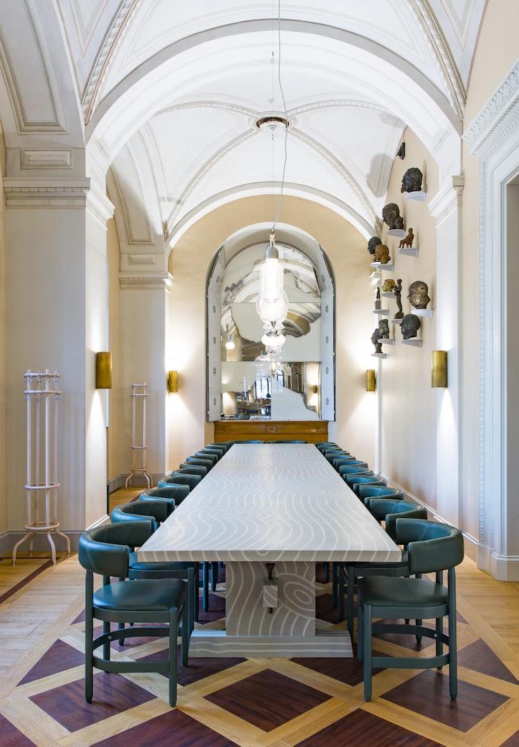 这个上下两层的空间由废弃的造船厂改建而成,浓重的工业气质、裸露的管道之下, FOGIA 用不同作品围合成一个个不同氛围的家庭空间。一层展厅的尽头便是专门辟出来的用餐空间,可在一天的看展结束后来这里歇歇脚,稍作休息。