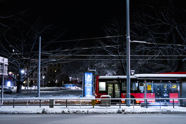 从机场到酒店的路上,除了厚重的积雪,让人无法忽略的是路边大片的树木 —— 在接下来的几天里,这些高挺、纤细的北欧树木始终是城市里不可或缺的景致,在极夜墨蓝色的天空之下以奇异的姿态伸向远处。