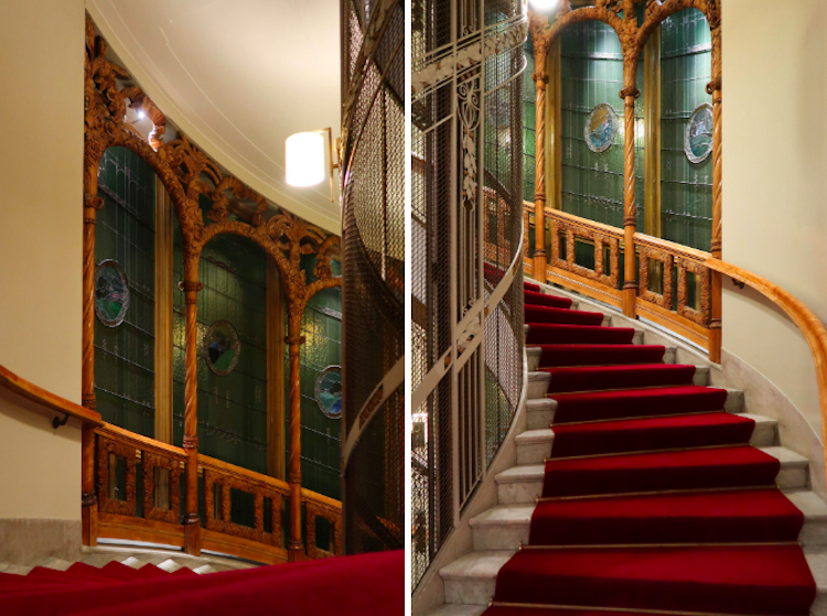 这栋 1966 年改建、开业的酒店前身是一栋拥有“新艺术运动”建筑风格的、真正的宫殿,这一点从大堂的装饰色调、繁复华丽的玻璃窗、红色地毯铺就的旋转楼梯和雕花装饰的古董电梯便可见一斑。