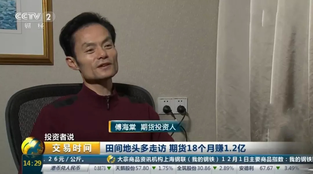 上面提到,大佬傅海棠从事期货行业已有18个年头了。在此之前,他在农村养了6年猪,进入期货行业,缘于一次去亲戚家串门。