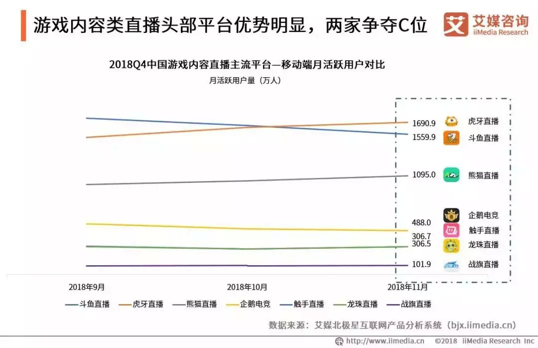 其中,虎牙与斗鱼不相上下,共同争夺C位。龙珠直播于2018年11月被停播整顿、熊猫直播陷入破产传闻,基本已退出第一梯队的游戏直播平台。