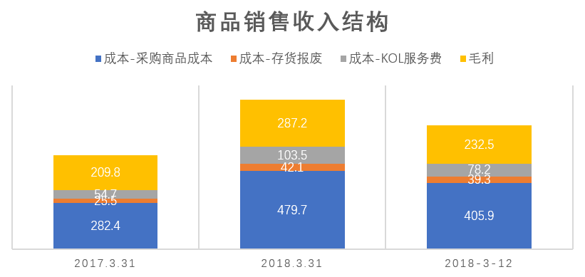 以2018年度为例。销售商品的合计收入为9.12亿元,其中成本主要分为采购商品成本、存货报废成本以及KOL服务费三大块成本,2018年三块成本分别占收入的比重为53%、5%以及11%。刨去成本之后,毛利率约为31%。换而言之,一件单品的收入中,有一半是物料成本,而KOL们的“提成”比例约为一成。