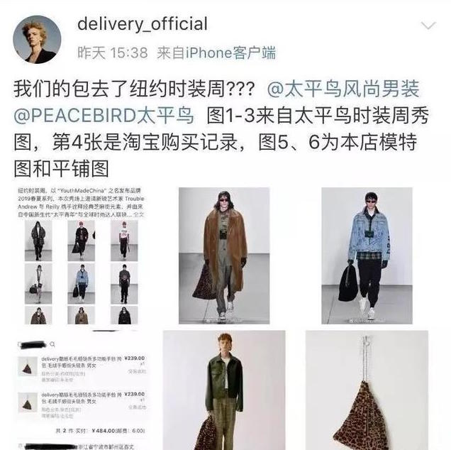 2019年纽约时装周,PEACEBIRD更是与艺术家Trouble Andrew,REILLY,芝麻街三方联名合作系列。当媒体为其欢呼雀跃,并称其为一次新的中式叙述,秀出中国新生代。网友们终于按耐不住,可以说对于太平鸟2019年并不太平。先是被指设计频频抄袭,但最乌龙的就是微博实名举报其在纽约时装周走秀时领着包就是自己家的品牌,吊牌价200元,收货地址为太平鸟设计部。