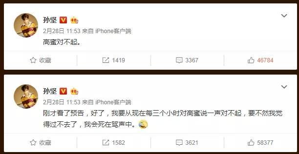 再看眼下正在播出的《逆流而上的你》、《都挺好》的主演孙坚、郭京飞,也都是求生欲满满。孙坚根据剧情走向,专门发微博让网友骂邹凯解气、和催离婚网友花式互动、连续发博向剧中妻子高蜜道歉。包括郭京飞在《都挺好》开播第二天,发文“我就这么说吧 我完了……”巧妙回应#苏明成出来挨打#的微博热搜,还在评论区自喊“打倒苏明成”并求饶“那什么……别打我……”。