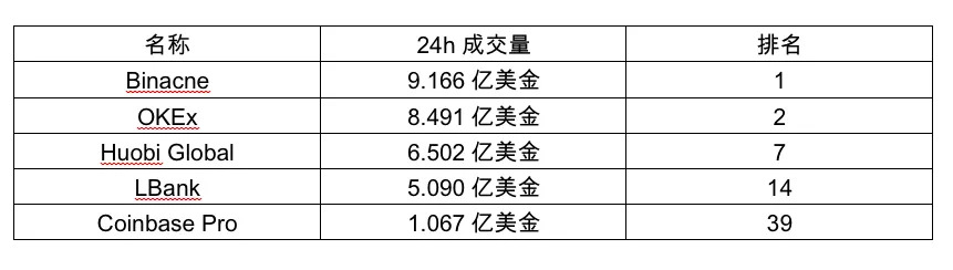 我们选取圈内五家比较有代表性的交易所,分别是币安、火币、OKEx、Coinbase Pro和LBank,截至3月7日,17:00 UTC+8,它们在Coinmarketcap的24h现货成交量分别是: