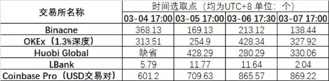 我们以BTC/USDT(USD)交易对为研究目标,连续4天分析了上述五家交易所的1%深度情况,收集到了下列数据: