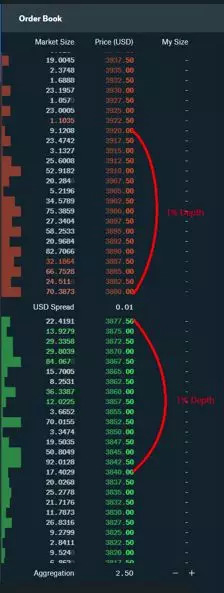 这个概念相对比较容易理解,假如卖一手的价格是4000.1 USDT,卖一手的价格为4001.0 USDT,则Spread为4001.0-4000.1=0.9 USDT。如果买一价和卖一价相差过大,如卖一价是4100美元,买一价是3900美元,则对于市价成交者来说是很不划算的。因此Spread值越低越好。