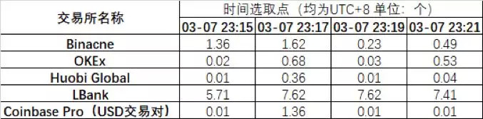 因此从Spread的角度来看,有:Coinbase Pro≈火币≥OKEx、币安>>LBank
