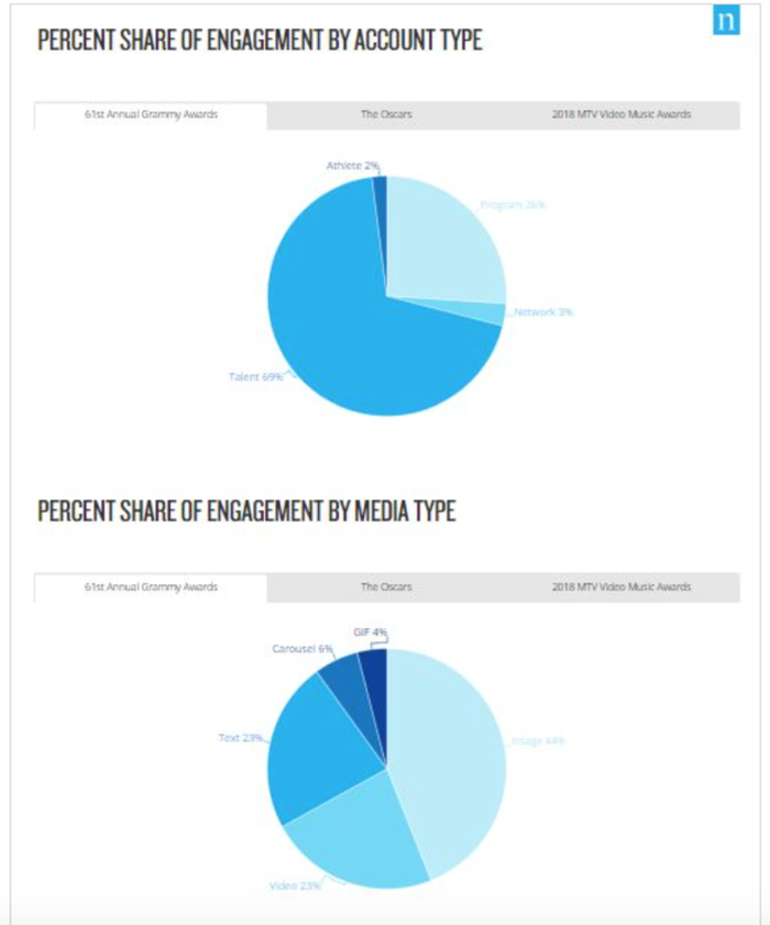 除此之外,尼尔森还对颁奖礼期间最受欢迎的帖子及其背后的创作人才进行了分析。在格莱美颁奖典礼期间,大部分的社交互动(69%)来自于这些才华横溢的晚会参与者(而并非来自电视台或节目推广),这无疑有助于提高其在社交影响力中的排名。