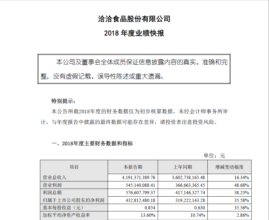 在此之前,洽洽食品(002557.SZ)发布了2018年度业绩快报,实现营业总收入约为41.91亿元,同比增幅在16%左右;归属于上市公司股东的净利润接近4.33亿元,和2017年同期3.19元相比,增幅在35%以上。