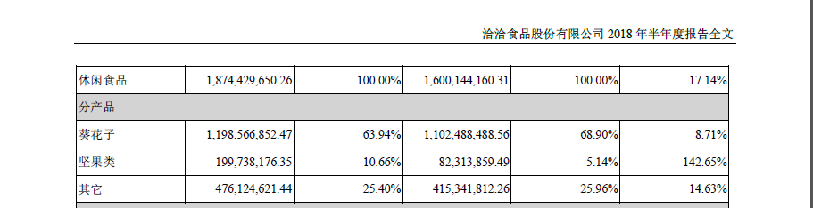 数据显示,分产品来看,2018年上半年,洽洽食品旗下坚果类贡献营业收入接近2亿元,同比增幅在142%左右。